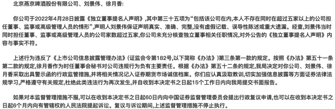 《警示函》内容显示,2022年4月28日,燕京啤酒曾披露《独立董事提名人声明》,其中一项内容提及“包括该公司在内,本人不存在同时在超过五家以上的公司担任董事、监事或高级管理人员情形”,声明人刘景伟保证声明真实、准确、完整,没有虚假记载、误导性陈述或重大遗漏。彼时,独董新规尚未颁布,独立董事最多可以在五家境内上市公司任职。