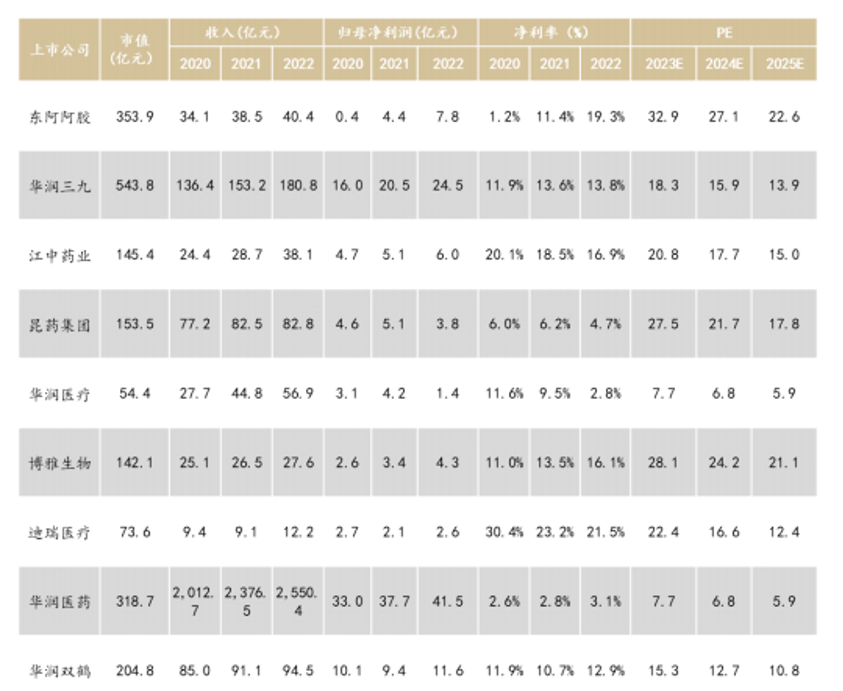 截至今年2月24日,华润集团旗下9家医药上市公司(包括A股、港股)的市值合计约为1990亿元。其中,华润三九(000999.SZ)市值最高,为543.8亿元;东阿阿胶(000423.SZ)次之,为353.9亿元;华润双鹤为204.8亿元,市值在9家公司中居中。