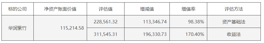 本次交易选用收益法评估结果为依据,截至2023年8月31日(评估基准日),华润紫竹100%股权的净资产账面价值逾11亿元,收益法评估值为31.15亿元,此次收购增值率170.40%。