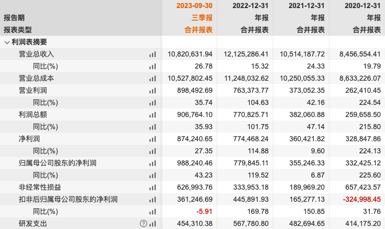据长安汽车披露的最新业绩显示,2023年前三季度,公司实现营收1082.1亿元,同比增加26.8%;归母净利润98.8亿元,同比上升43.2%。同期,该公司综合毛利率为17.88%,而上一年度的毛利率为20.32%,下滑了2.44个百分点。不难看出,该公司尽管业绩大超预期但毛利率同比下滑明显。
