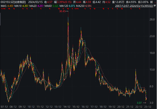截至3月15日收盘,如意集团报收于4.47元/股,今年以来股价累计下跌超30%,当前总市值为12亿元。