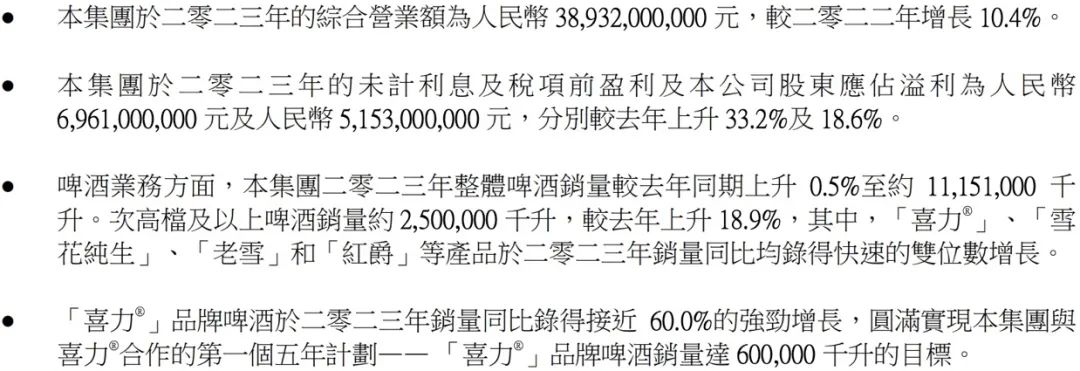 华润啤酒2023年业绩概况及啤酒业务经营情况