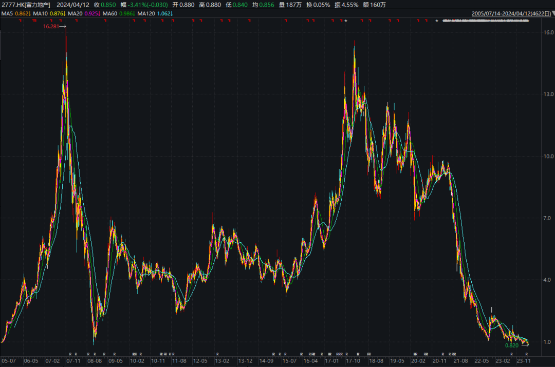 截至4月12日收盘,富力地产报收于0.83港元/股,股价已不足1港元。