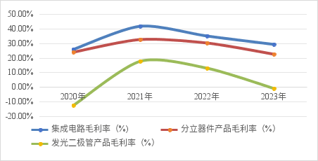 从士兰微财报来看,2023年,公司主营业务毛利率为22.29%,较上年减少7.31个百分点。分产品来看,集成电路毛利率为29.47%,同比减少5.56个百分点;分立器件产品毛利率为22.73%,同比减少7.49个百分点;发光二极管产品的毛利率则重回负值,为-1.01%,同比大减近14个百分点。而若与2021年同期相比,前述各产品的毛利率均已大幅减少逾十个百分点。其中,尤以发光二极管产品降幅最大,较2021年大幅下缩19.05个百分点。