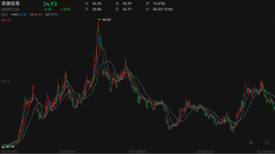 二级市场方面,2023年,由ChatGPT引发的AIGC(生成式人工智能)发展热潮,让众多AI概念股迎来一波上涨行情,浪潮信息股价也从年初的21.46元/股(前复权,下同)一路走高,并于2023年6月20日触及历史最高价66.04元/股,市值逼近千亿元大关。此后该公司股价持续震荡回落。截至4月23日,浪潮信息股价报于34.93元/股,单日跌幅为1.63%,较一年前高点已下挫47%,目前市值为514亿元。