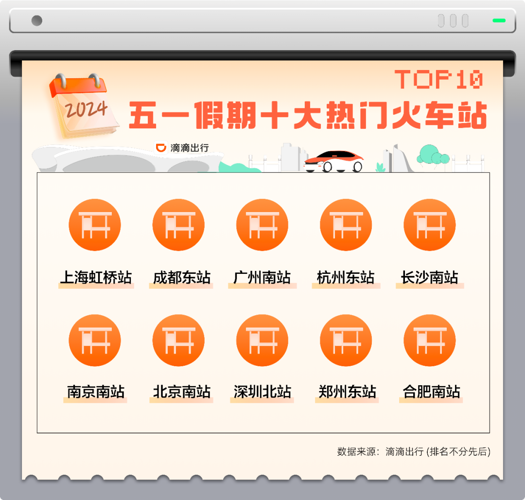 跨城跨省出游带动下,五一假期前往大型交通枢纽的打车需求环比节前上涨73%。从叫车需求量看,上海虹桥站、成都东站、广州南站等领衔今年五一十大热门火车站。在相关主管部门指导下,滴滴在北京、长沙、成都、临沂、泉州、厦门等地组建保障车队,在重点场站、景区等场景,协助进行出行高峰时段的旅客疏散和转运。