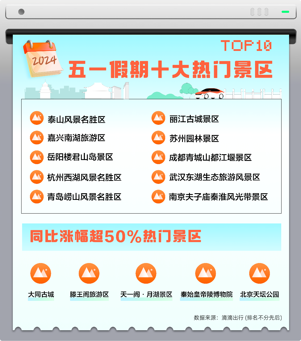 与去年五一相比,大同古城、滕王阁旅游区、天一阁·月湖景区、秦始皇帝陵博物院、北京天坛公园等景区今年打车需求火热,同比上涨均超过50%,其中大同古城的打车需求同比涨幅为114%。