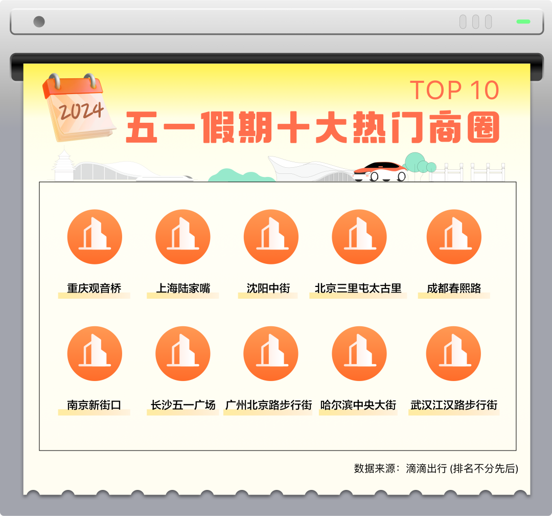 承载了“逛吃玩”需求一体的大型商圈也是五一出行的热门。假期前往大型商圈的用车需求环比上涨118%。从打车需求来看,重庆观音桥、上海陆家嘴、沈阳中街等成为今年五一十大热门商圈。其中前往重庆观音桥、长沙五一广场的用车需求同比上涨均超50%。
