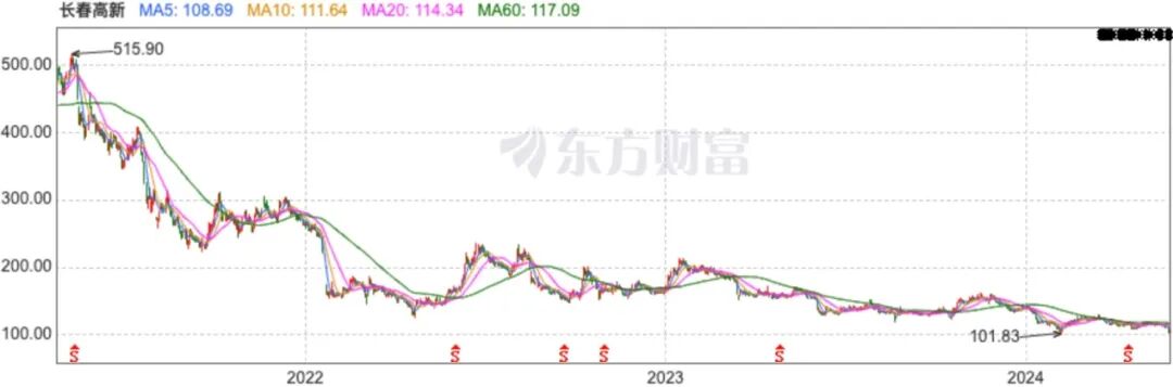 从二级市场来看,长春高新的股价并非因为传闻才开始下跌。早自2021年5月17日触及515.90元/股高点后,该公司股价便呈现出走低趋势,一路跌至200元/股以下。期间还于2024年2月5日触碰近几年低点101.83元/股,此低点距离515.90元/股已经跌去80.26%。