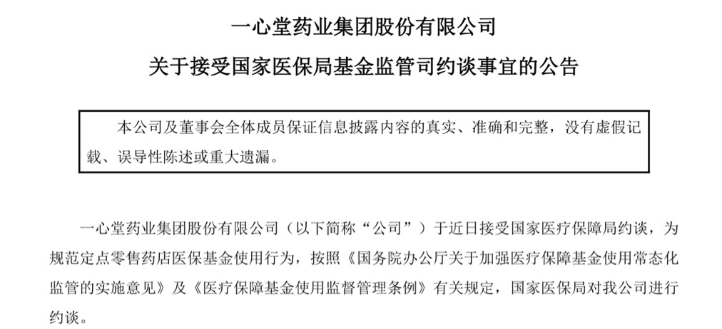 对此,一心堂相关负责人表示,本次约谈指出的问题对企业是重要的警醒。下一步,公司将坚持问题导向,按照约谈提出的要求,成立工作组,用实质性的整改举措规范旗下连锁门店经营行为。同时,按照约谈要求,一心堂将于6月底前向国家医保局基金监管司提交整改情况报告。