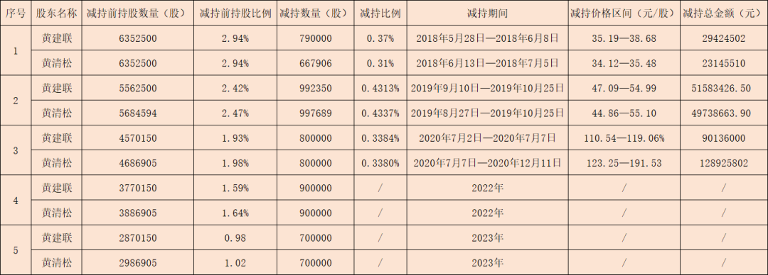 2018年5月2日,股份解禁仅两个多月后,黄建联和黄清松即进行了首次减持,最终黄建联减持79万股,套现2942.45万元;黄清松减持66.79万股,套现2314.55万元。2019年8月14日,黄建联和黄清松再次计划减持,最终分别减持99.24万股和99.77万股,分别套现5158.34万元和4973.87万元。2020年6月15日,黄建联和黄清松表示将要减持,最终这两人均减持了80万股,但由于减持期不同,其中黄建联套现9013.60万元,黄清松套现1.29亿元。