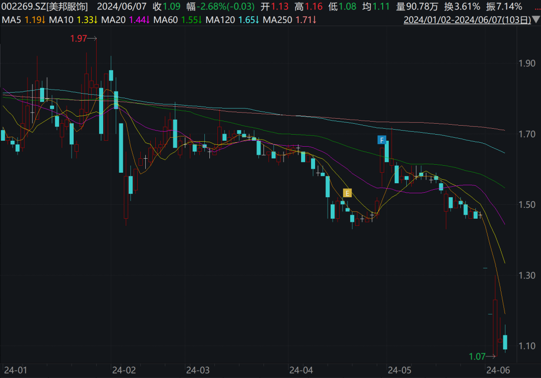 2024年6月3日、6月4日和6月6日,美邦服饰股价均现跌停情况,由跌前5月31日1.47元/股(按前复权计算,下同)的收盘价跌至1.12元/股,仅高出1元/股的警戒线0.12元。