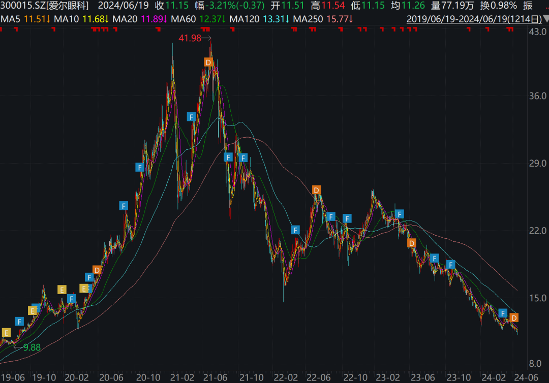 截至6月19日收盘,爱尔眼科报11.15元/股,总市值约为1040亿元,已较最高点蒸发超七成