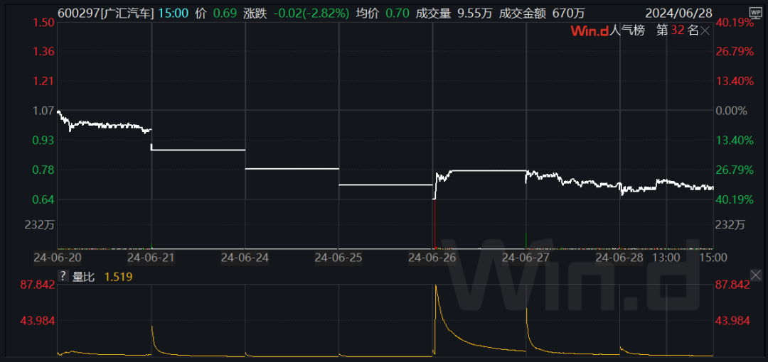 此后几日,二级市场情况并未好转,6月21日、24日、25日,公司股票连续三个交易日处于一字跌停状态,虽然6月26日股价开盘一字跌停后上演地天板,但也仅收于0.78元/股。截至6月28日,广汇汽车股价已连续7个交易日收盘价低于人民币1元,退市风险与日俱增。
