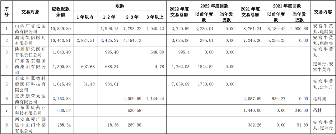 值得关注的是,2021至2023年,广誉远的应收账款水平有所下降,各期应收账款分别为10.85亿元、8.75亿元、4.88亿元。对于账龄为1至2年及2至3年的应收账款事项,广誉远在回复上交所的公告中补充披露了前五大应收账款交易对象,并表示账龄超过1年的均视为逾期。