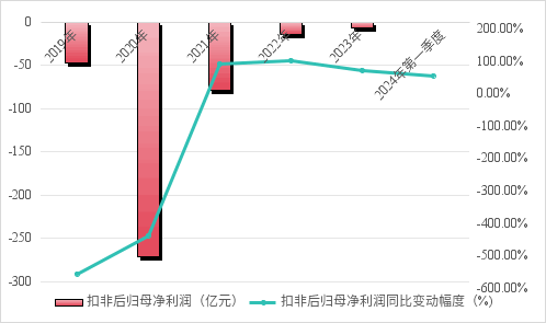 但随着广药集团入主,公司于2021年底完成破产重整、迎来转机。2023年、2024年第一季度的归属于母公司股东的净利润(下称归母净利润)扭亏为盈,分别盈利1.03亿元、747.13万元;不过,扣非后的归母净利润仍为负数。粗略计算,自2019年以来的五年多时间,该公司扣非后归母净利润共计亏损逾420亿,“造血”能力仍有不足。