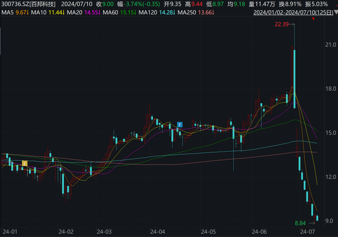 从6月27日至7月10日10个交易日内,公司股价从22.39元/股阶段性高点一直跌至7月10日收盘的9元/股,整体跌幅高达60%。期间最大回撤为60.52%,换手率超100%,公司市值仅剩12亿元。