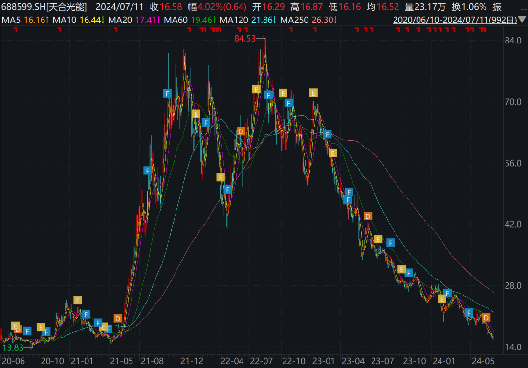 不过上述举动并未能提振市场信心。截至7月11日收盘,天合光能报收于16.58元/股,当前总市值为361亿元,股价和总市值均处于近三年低位。