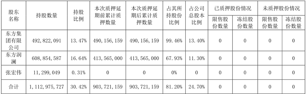 其中,东方有限未解押股权质押数量为4.90亿股,占公司总股本的13.40%;东方润澜未解押股权质押数量为4.14亿股,占比11.30%。另外,东方有限和东方润澜合计质押给民生银行的股份数达4.42亿股,质押给中信证券的股份数合计达2.65亿股。被中信证券平仓后,上述一致行动人合计持有公司股份降至10.90亿股,占公司总股本的比例为29.79%。