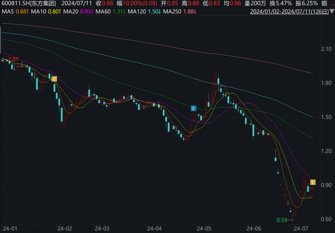 标点财经、投资时间网研究员注意到,今年6月中下旬以来,受存款大额提取受限、被立案调查、债务逾期等多重消息影响,东方集团股价大幅下跌,并于7月1日触及0.59元/股(不复权,下同)的历史低点。截至7月11日收盘,该股收报0.88元/股,市值为32亿元。