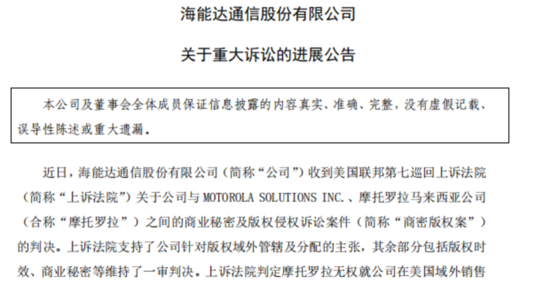 海能达通信股份有限公司(下称海能达,002583.SZ)公告称,收到美国联邦第七巡回上诉法院(下称上诉法院)关于公司与摩托罗拉之间的商业秘密及版权侵权诉讼案件判决。上诉法院支持公司针对版权域外管辖及分配的主张,但包括版权时效等其余部分仍维持一审判决。