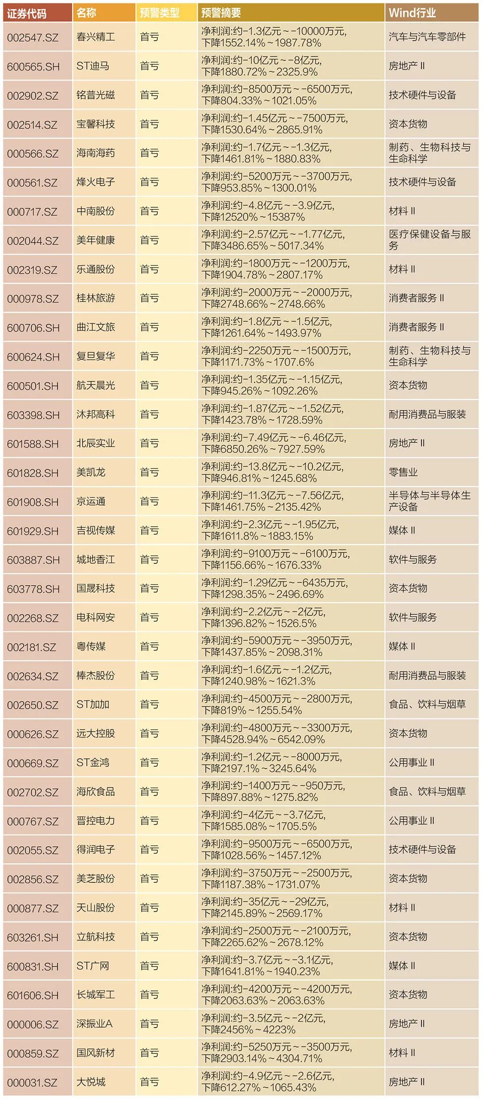 37家首亏公司净利同比预降超1000%