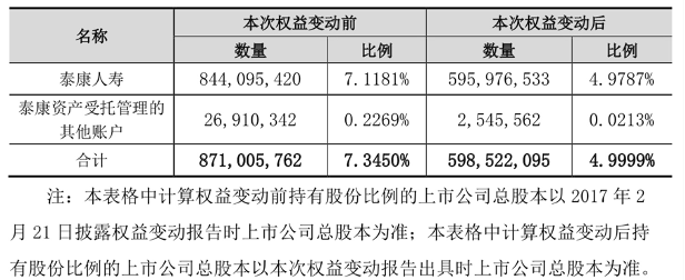 减持后,泰康人寿的股份比例由7.12%降至4.98%,泰康资产受托管理的其他账户股份比例由0.23%降至0.02%,两者合计股份比例由7.35%降至4.99%。
