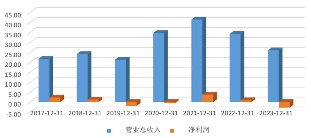 2017年,科森科技在沪市主板上市后,业绩便呈现出时好时坏的波动态势。2018年,公司营收增长,净利润却同比大幅下滑;2019年,公司营收和净利润均出现下滑,并迎来上市首亏;2020年,情况有所好转,营收增长的同时净利润亏损收窄,并在2021年实现扭亏为盈。但还没待缓过一口气,科森科技业绩又从2022年开始持续下滑,2022年和2023年,公司分别获得营业收入34.24亿元和25.97亿元,同比减少17.44%和24.16%,同期净利润分别为0.87亿元和-2.81亿元,同比大幅下降76.48%和424.29%。
