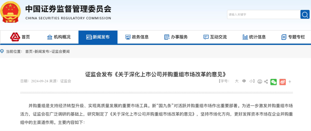 9月24日上午,在国务院新闻办公室举行的新闻发布会上,证监会主席吴清表示,为进一步激发并购重组市场活力,证监会在广泛调研的基础上,研究制定了“并购六条”,坚持市场化方向,更好发挥资本市场在并购重组中的主渠道作用。