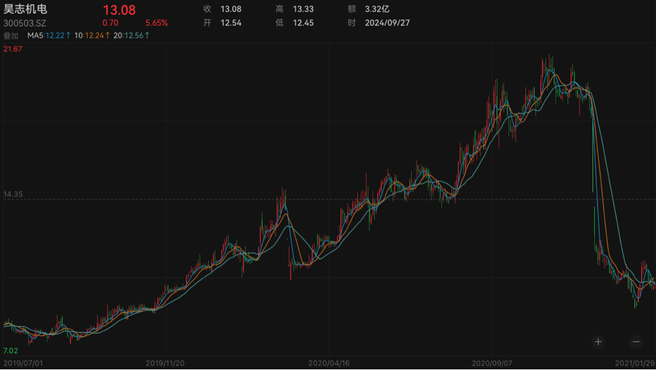 尽管昊志机电在公告中表示,上述处罚仅涉及个人,不会对公司的生产经营及财务状况产生重大影响,也不构成重大违法强制退市情形。但从二级市场反应来看,上述消息仍波及到公司股价。9月24日开盘后,昊志机电股价一度下跌10.81%。当日收盘,该股报11.74元/股(不复权,下同),总市值为36亿元。此后,或受A股普涨影响,公司股价有所回升。截至9月27日收盘,公司股价收于13.08元/股,市值约为40亿元。