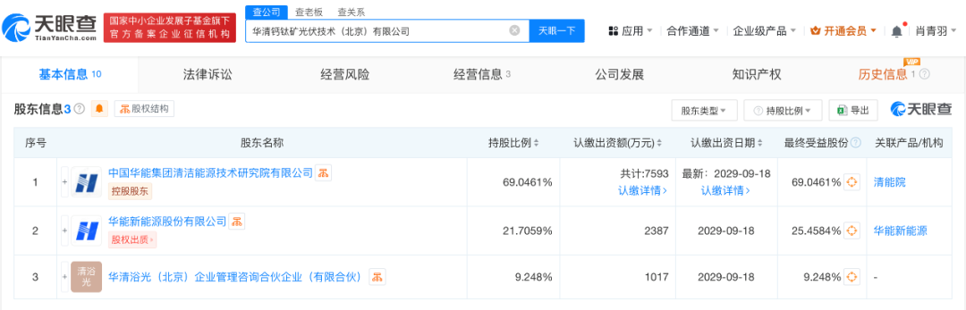 股东信息显示,该公司由华能新能源股份有限公司、中国华能集团清洁能源技术研究院有限公司、华清浴光(北京)企业管理咨询合伙企业(有限合伙)共同持股。