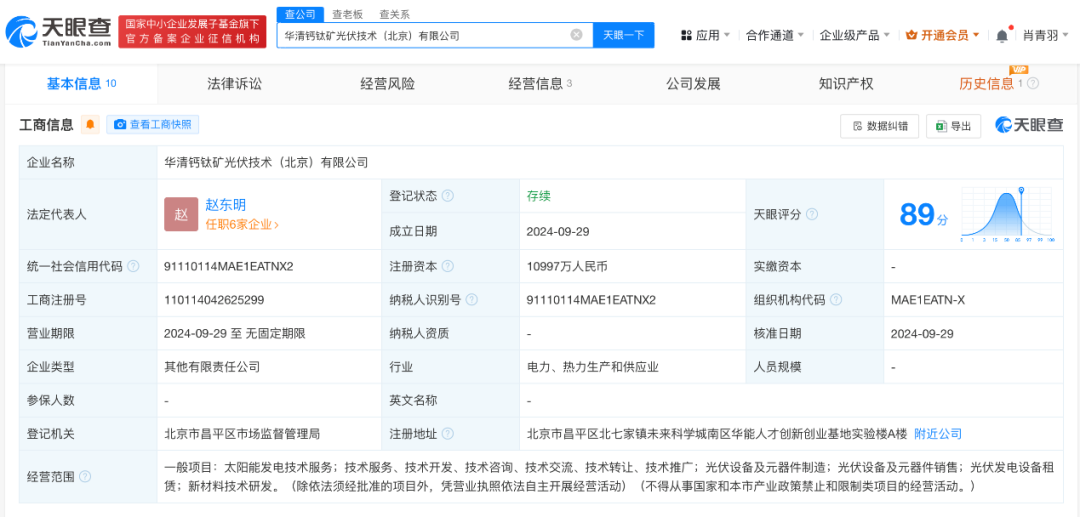 近日,华清钙钛矿光伏技术(北京)有限公司成立。天眼查App显示,该公司法定代表人为赵东明,注册资本约1亿人民币,经营范围含太阳能发电技术服务、光伏设备及元器件制造、光伏设备及元器件销售、光伏发电设备租赁、新材料技术研发等。