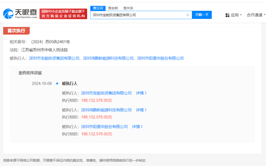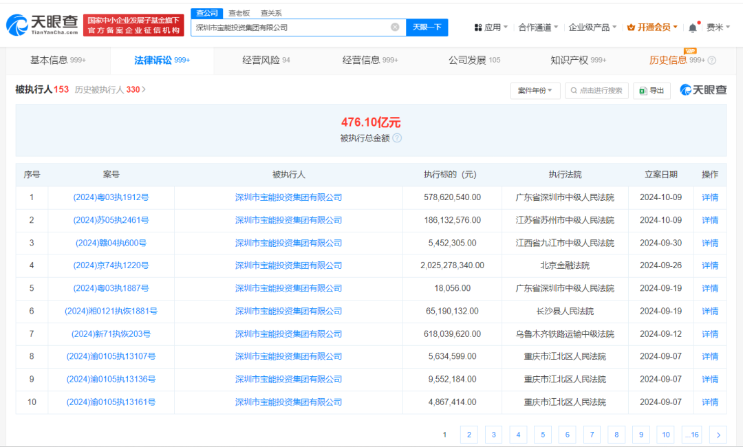 深圳市宝能投资集团有限公司现存150余条被执行人信息