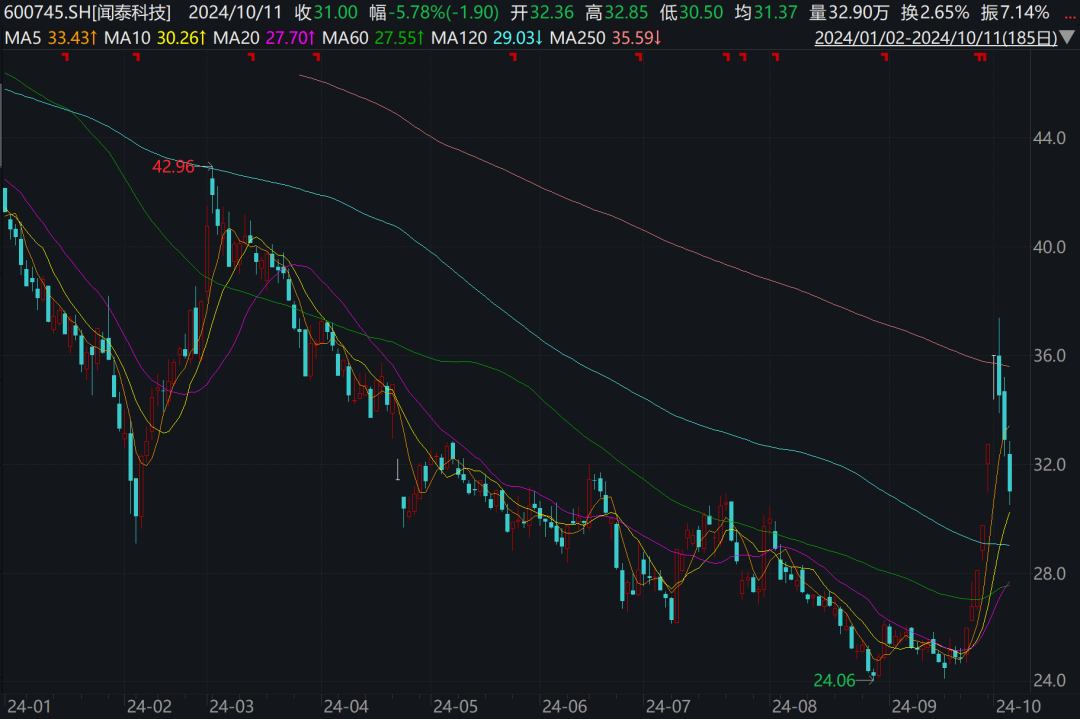 近期,随着A股大盘整体上涨,众多上市公司股价纷纷开始反弹。闻泰科技也迎来股价回升的契机,该公司股价从低点一路回弹至2024年10月9日的37.39元/股,与一个多月前的24.06元/股相比,涨幅高达55.40%。从9月24日至10月8日,该公司连续上涨6天,10月8日当天更收报涨停。也就在10月8日涨停那天,闻泰科技发布了关于股东减持计划实施主体增加的公告,宣布公司于国庆节前披露的股东减持计划中新增了格力电器这一重要股东。随后,公司股价连跌三天,每日跌幅分别为4.08%、4.72%、5.78%。