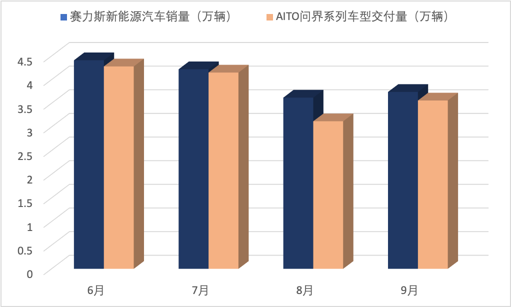 目前,问界系列车型已成为赛力斯汽车销量的重要支柱。据产销快报显示,2024年9月,赛力斯新能源汽车月销量为3.74万辆,同比增长265.09%。据鸿蒙智行公告披露,AITO问界系列车型同年9月单月交付达到3.56万辆,其中,全景智慧旗舰SUV问界M9系列交付1.55万辆,连续6个月蝉联中国豪华市场50万以上车型销量冠军;国民SUV问界新M7系列交付1.68万辆。相比之下,赛力斯其他自有品牌的市场表现相对平淡,销量与问界系列存在较大差距。