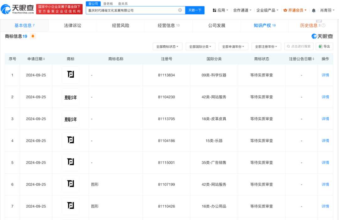 天眼查知识产权信息显示,近日,重庆时代峰峻文化发展有限公司申请注册多枚“登陆少年”文字及图形商标,国际分类为广告销售、网站服务、教育娱乐等,当前商标状态为等待实质审查。