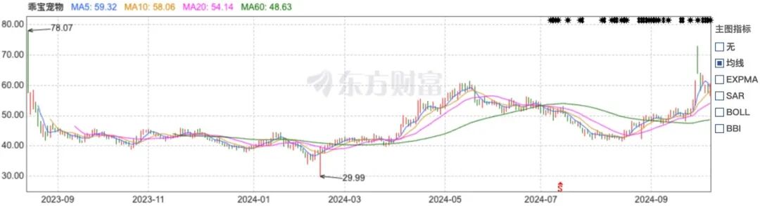 近期,随着A股大盘整体呈现出显著上涨趋势,市场氛围明显回暖,众多上市公司的股价也随之大涨,乖宝宠物同样受益于这一积极的市场环境,股价连续多日上涨。2024年10月8日,乖宝宠物股价成功重返72.88元/股的高位,已接近该公司上市首日所触及的78.07元/股高点。