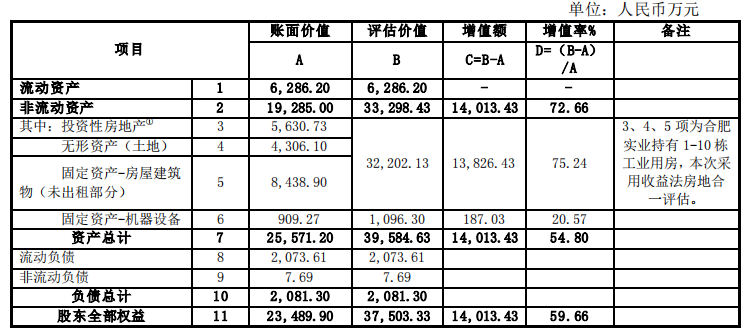 该标的公司主要资产为土地及厂房等。截至2024年6月30日,净资产为2.35亿元,评估价值为3.75亿元,增值率近60%。评估增值最多的是长虹实业的非流动资产,其中投资性房地产、无形资产(土地)、固定资产—房屋建筑是指标的公司持有的1—10号工业用房,采用收益法房地合一评估,增值额逾一亿。