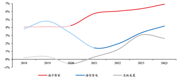 但对比海尔、海信,长虹美菱的盈利能力尚有一定差距。数据显示,海尔智家(600690.SH)2023年、2024年中期的净利率分别为6.40%、7.82%;海信家电(000921.SZ)为5.60%、6.23%。长虹美菱却仅为3.19%和2.84%,低了几个百分点。