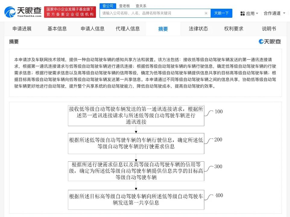 摘要显示,该申请涉及车联网技术领域,方法包括:接收低等级自动驾驶车辆发送的第一通讯连接请求,与其进行通讯连接;根据低等级自动驾驶车辆的车辆行驶信息,确定行驶需求信息;根据行驶需求信息以及高等级自动驾驶车辆的信用等级,确定为低等级自动驾驶车辆提供信息共享的目标高等级自动驾驶车辆;根据目标高等级自动驾驶车辆向低等级自动驾驶车辆发送第一共享信息。