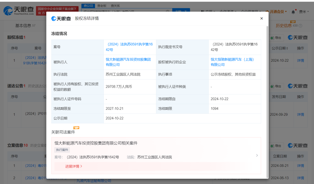 天眼查法律诉讼信息显示,近日,恒大恒驰新能源汽车(上海)有限公司新增一则股权冻结信息,被执行人为恒大新能源汽车投资控股集团有限公司,冻结股权数额约2.97亿人民币,冻结期限自2024年10月22日至2027年10月21日,执行法院为苏州工业园区人民法院。
