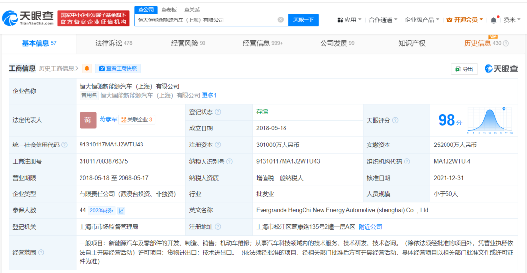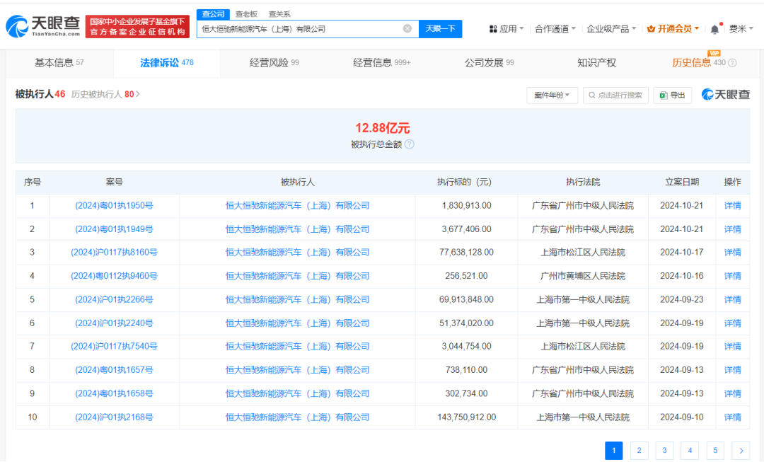 恒大恒驰新能源汽车(上海)有限公司现存40余条被执行人信息,被执行总金额超12亿元