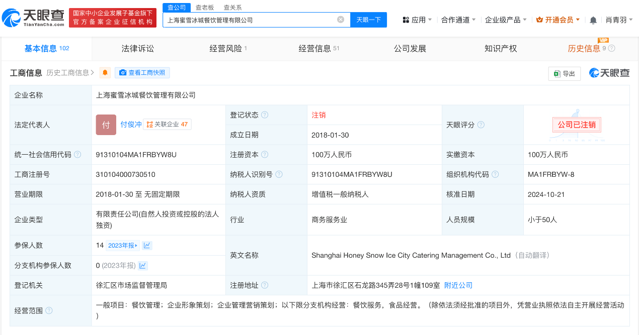 上海蜜雪冰城餐饮管理有限公司企业状态已由存续变更为注销
