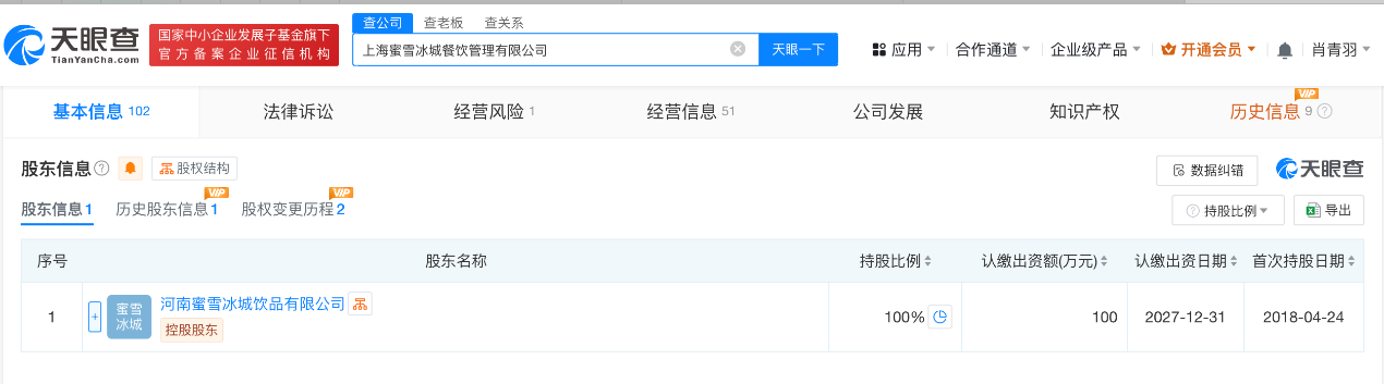 上海蜜雪冰城餐饮管理有限公司成立于2018年1月,法定代表人为付俊冲,注册资本100万人民币,经营范围含餐饮管理、企业形象策划、企业管理营销策划等。股东信息显示,该公司由蜜雪冰城旗下河南蜜雪冰城饮品有限公司全资持股。