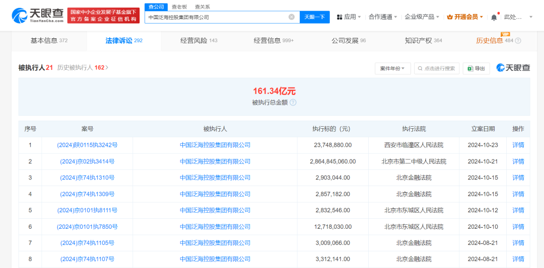 该公司现存21条被执行人信息,被执行总金额超161亿元