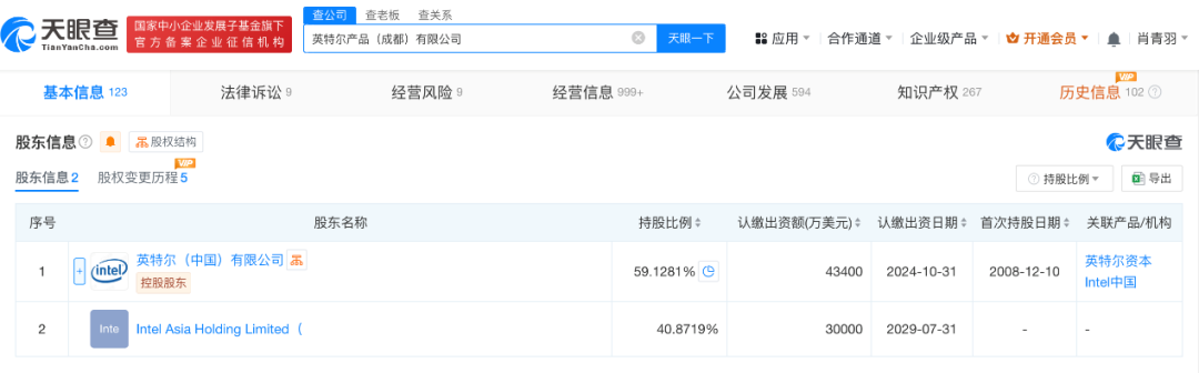 股东信息显示,该公司由英特尔(中国)有限公司及上述新增股东共同持股。