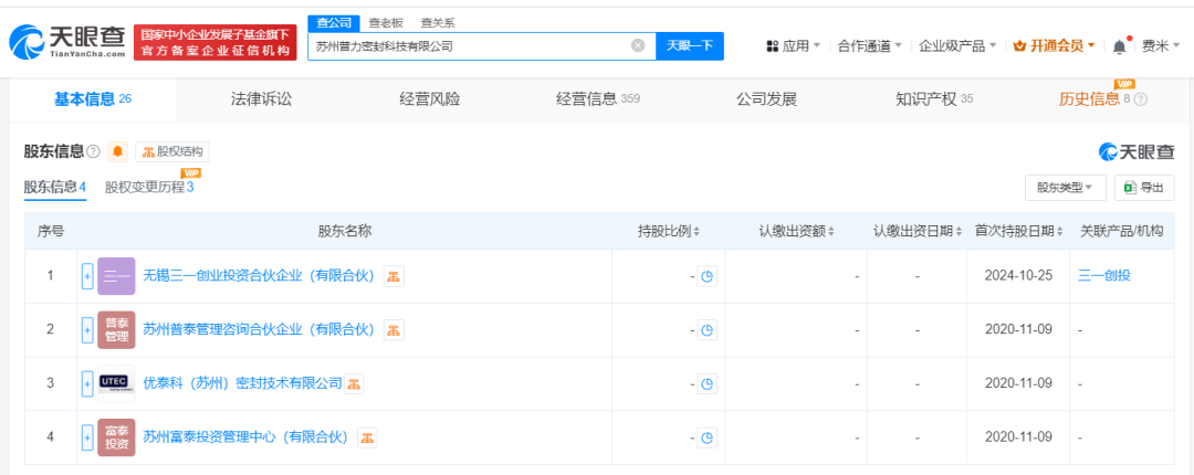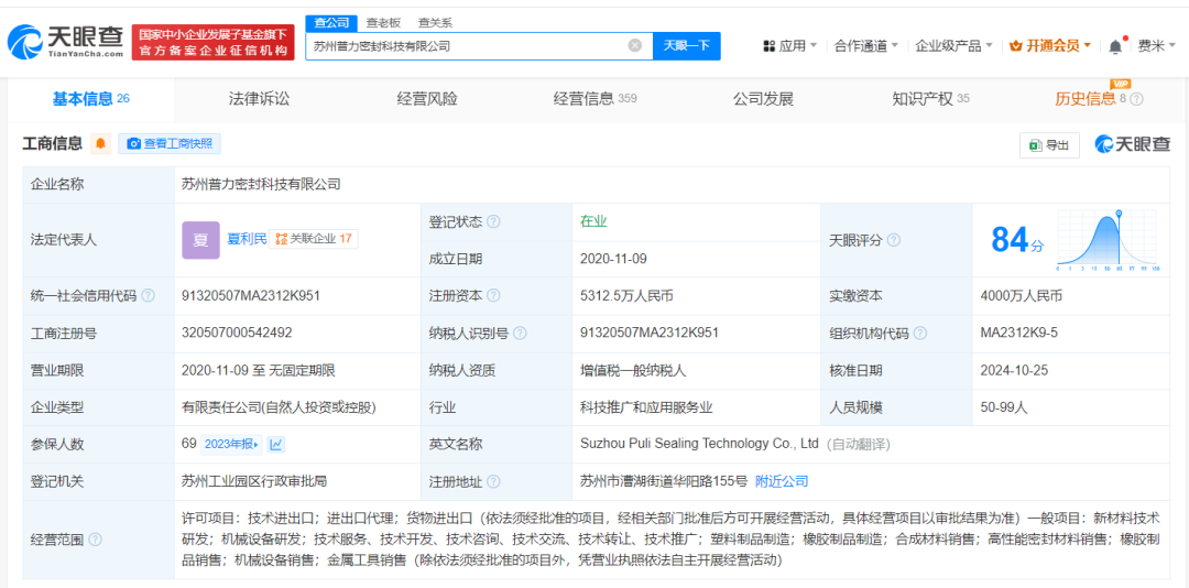 苏州普力密封科技有限公司成立于2020年11月,法定代表人为夏利民,经营范围含技术进出口、进出口代理、新材料技术研发、机械设备研发、塑料制品制造、橡胶制品制造等,现由苏州普泰管理咨询合伙企业(有限合伙)、优泰科(苏州)密封技术有限公司、苏州富泰投资管理中心(有限合伙)及上述新增股东共同持股。