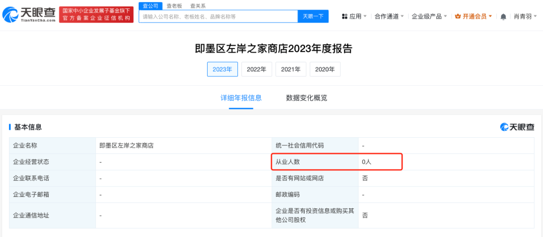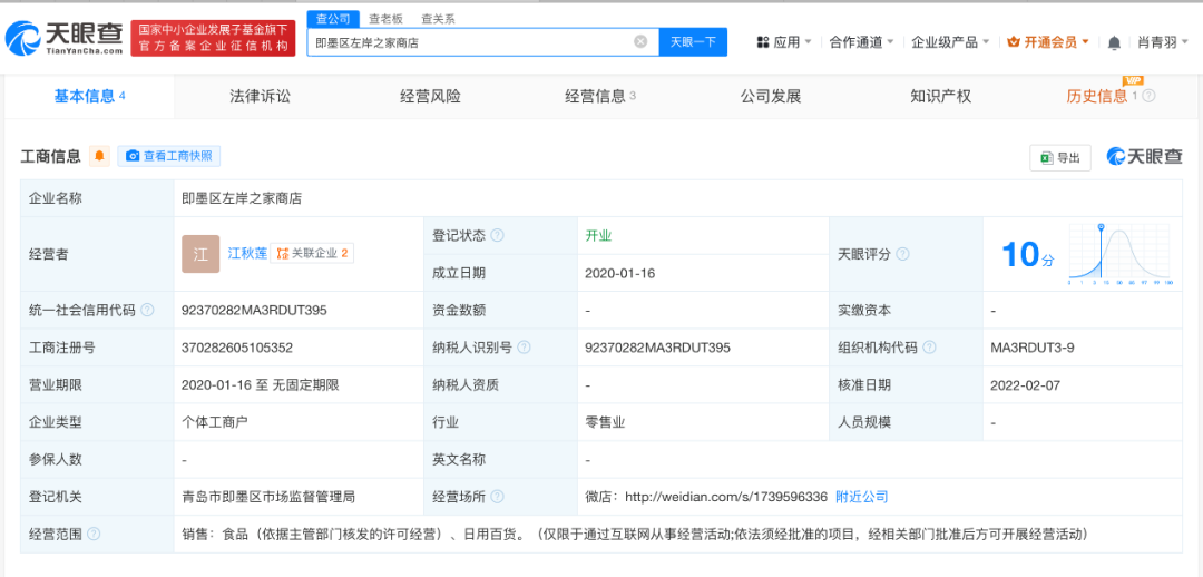 天眼查App显示,即墨区左岸之家商店成立于2020年1月,经营者为江秋莲,经营范围为销售食品、日用百货。年报信息显示,2022年、2023年该商店从业人数均为0。知识产权信息显示,江秋莲已成功注册1枚“左岸之家”商标。
