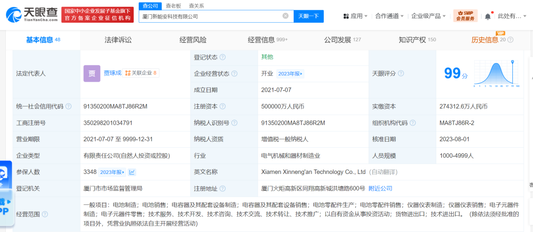 厦门新能安科技有限公司成立于2021年7月,法定代表人为贾琢成,注册资本50亿人民币,经营范围含电池制造、电池销售、电容器及其配套设备制造、电容器及其配套设备销售、电池零配件生产等。