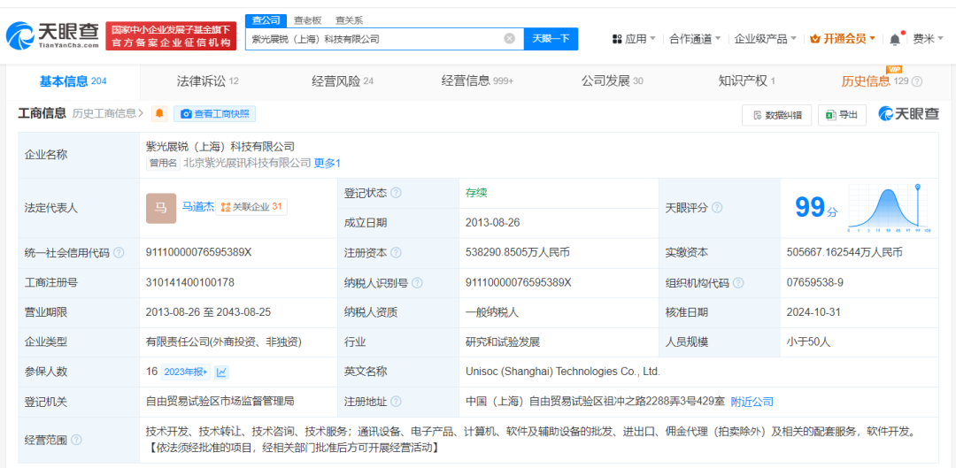 紫光展锐(上海)科技有限公司成立于2013年8月,法定代表人为马道杰,经营范围含通讯设备、电子产品、计算机、软件及辅助设备的批发、进出口、佣金代理(拍卖除外)及相关的配套服务,软件开发等,现由国家集成电路产业投资基金股份有限公司、中关村发展集团股份有限公司、英特尔(中国)有限公司及上述新增股东等共同持股。